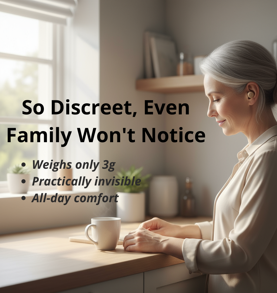 Most customers report that even close family members don't notice they're wearing them until they point them out. The discreet white or skin color blends naturally with your skin tone, and there are no visible wires or bulk behind the ear.